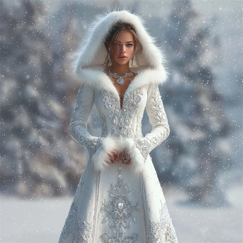 Vintage Snowflakes Jewel Art Fur Trim Hooded Maxi Sweater Dress