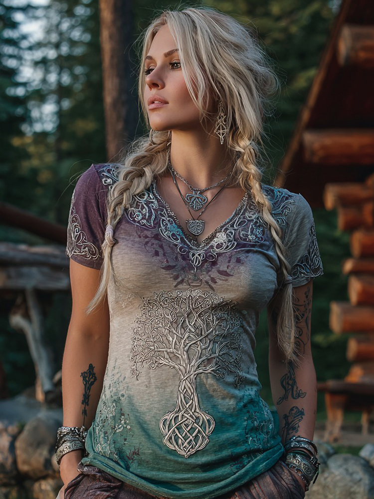 Vintage Viking Life Of Tree Embroidered Gradient Art T-shirt