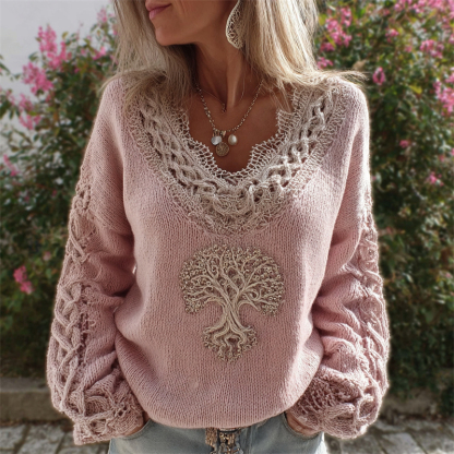 Vintage Viking Tree Of Life Lace V Neck Cozy Sweater