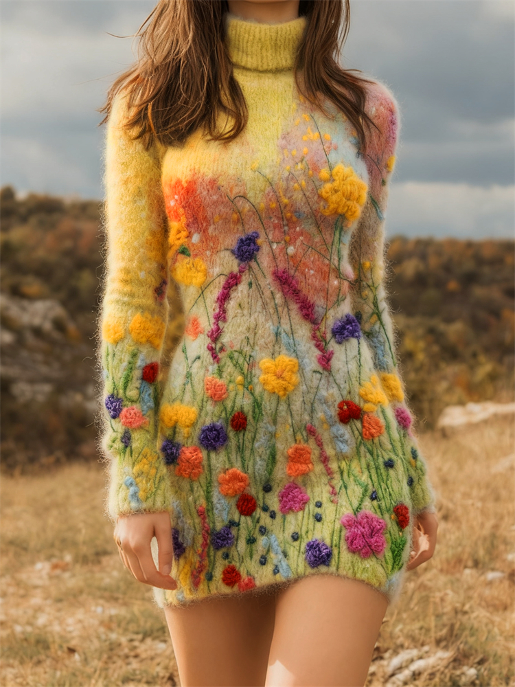 Wild Flowers Felt Embroidered Cozy Turtleneck Sweater Dress