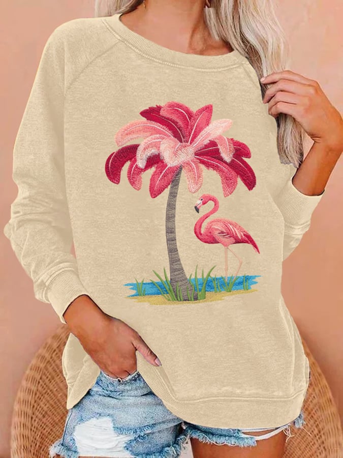 Women's Vintage Coconut Tree Flamingo Print Casual Round Neck Raglan Sweatshirt
