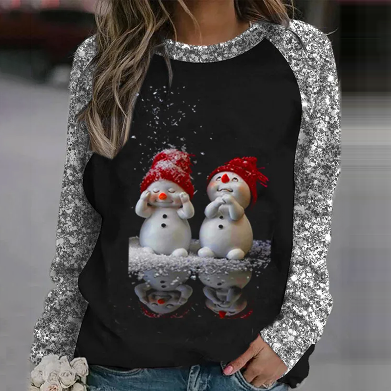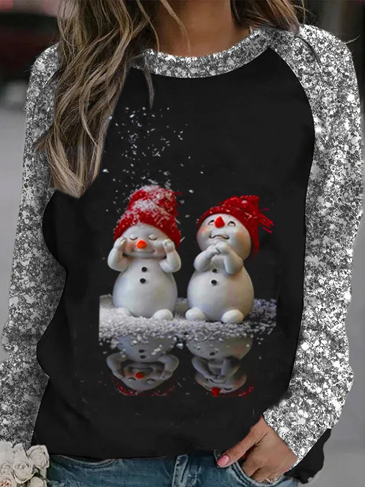 Women's Black and Silver Long Sleeve Christmas Cute Snowman Sweatshirt