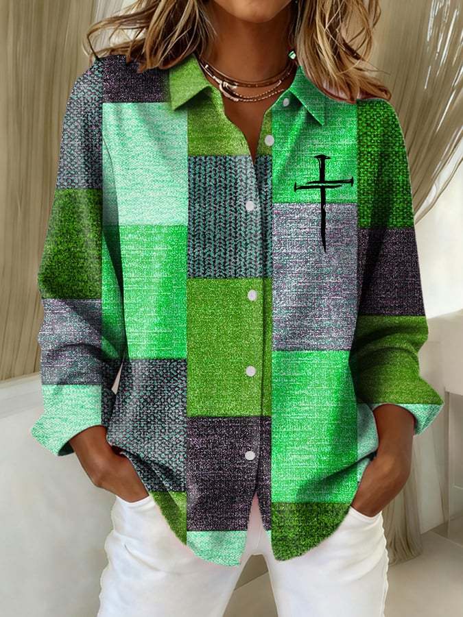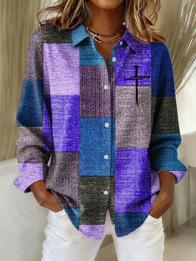 Women's Casual Autumn And Winter Retro Color Block Contrast Faith Shirt