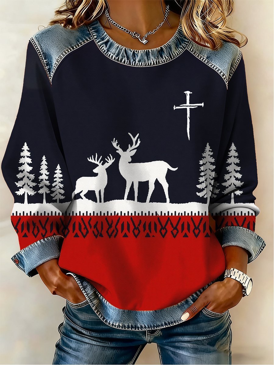 Women's Casual Retro Christmas Fleece-Lined Color-Blocked Sweatshirt