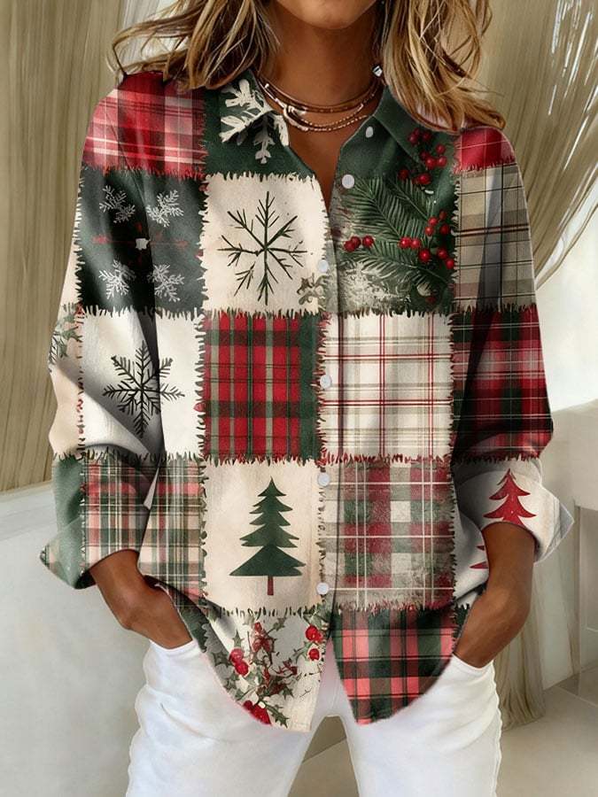 Women's Christmas Contrast Patchwork Print Casual Lapel Shirt