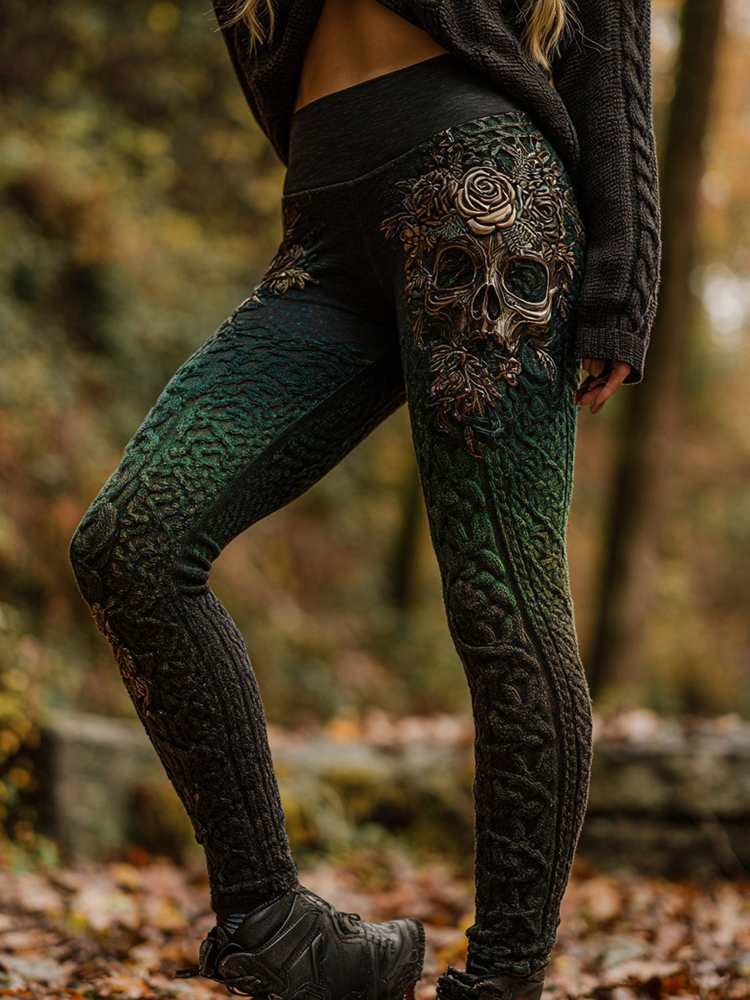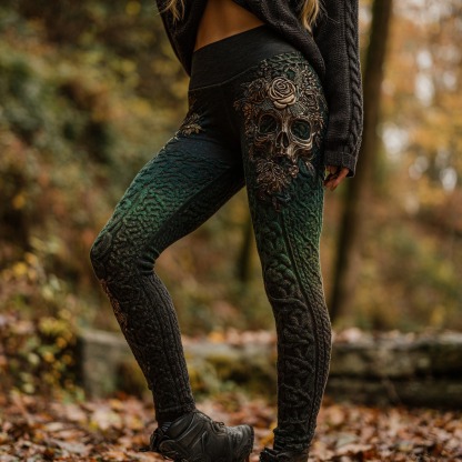 Women's Retro Skull Rose Embroidery Gradient Casual Leggings