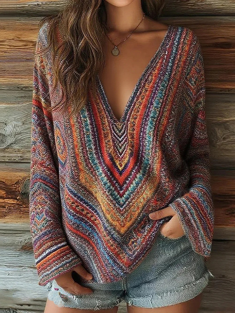 Women's Striped Art Print Casual V-neck Long Sleeve Top