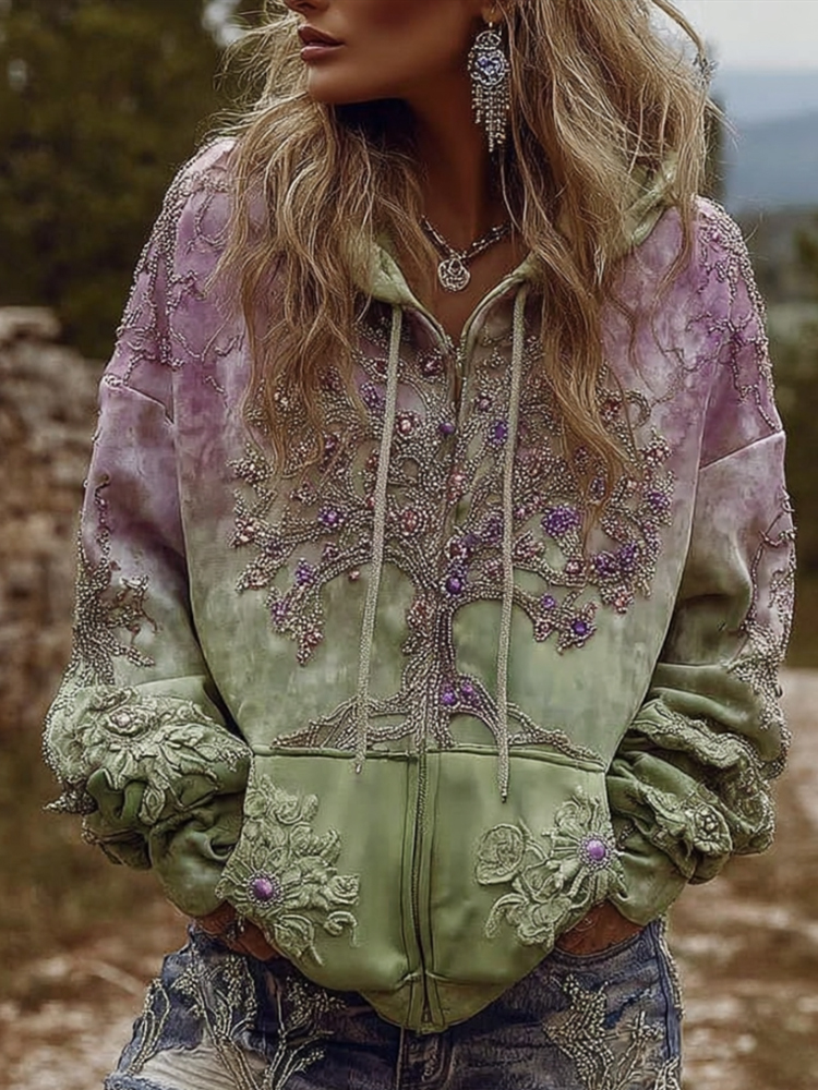 Women's Viking Style Life Tree Bead String Tie Dye Cardigan Hoodie