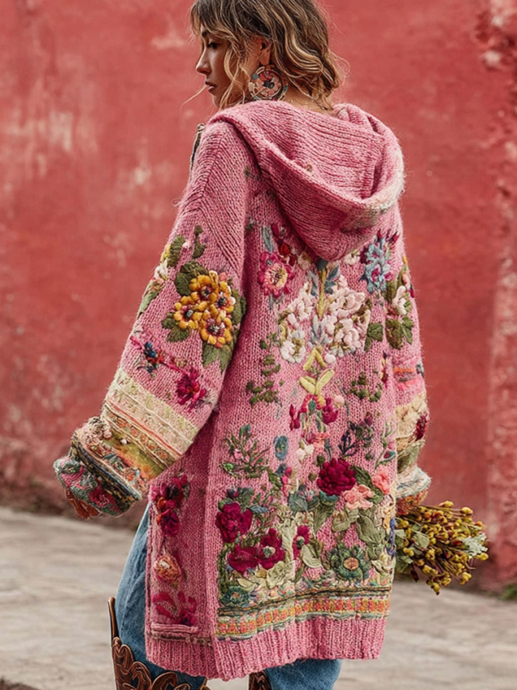 Women's Vintage Bohemian Floral Embroidery Art Cozy Knit Hooded Sweater Cardigan
