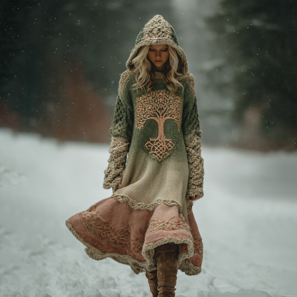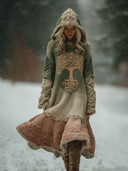 Women's Vintage Celtic Tree Of Life Ombre Hooded Sweater Midi Dress
