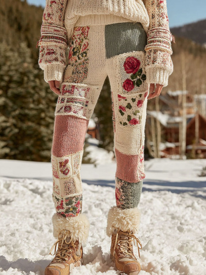 Women's Vintage Floral Patchwork Cozy Knit Leggings