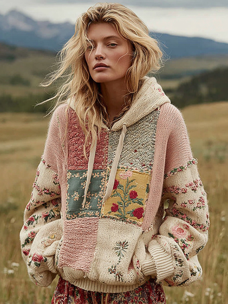 Women's Vintage Floral Patchwork Cozy Knit Sweater Hooded