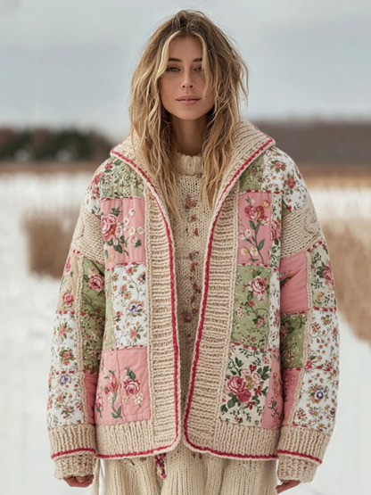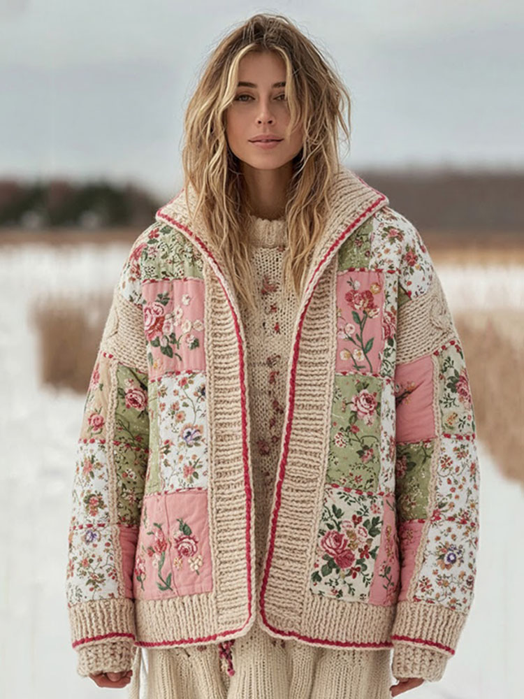 Women's Vintage Floral Patchwork Cozy Stand Collar Knit Sweater