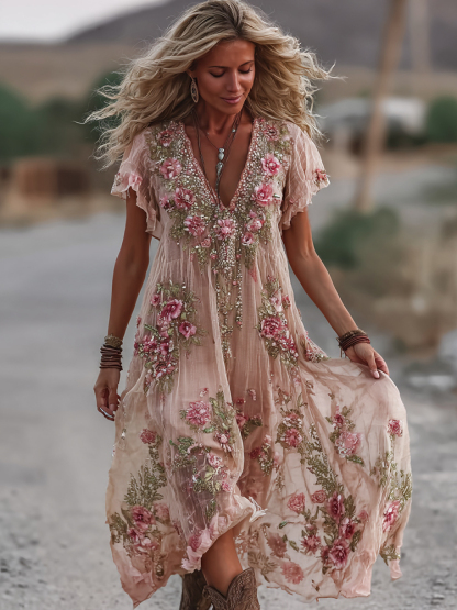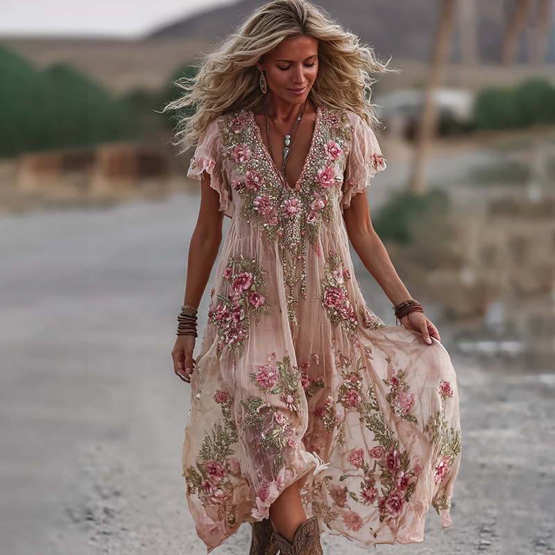 Women's Vintage Rose Embroidery Art Comfy Linen Maxi Dress