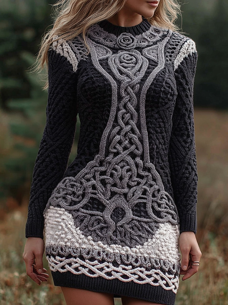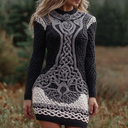 Women's Vintage Viking Celtic Knot With Rose Art Cozy Knit Mini Sweater Dress